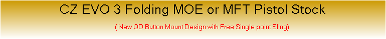 This is a newly designed Mount and Fab Defense Hinge with Magpul MOE or Battlelink MFT Stock for the CZ Scorpion EVO 3 Pistol. These can be set up to close left or right and have 5 slide positions on the tube. Hinges lock up tight in closed postion ( Spring cam actuated) . These are new styled mounts with soft tipped setscrews in the sides and no sloppy button release. Simply slide over and tighten the 4 screws with included wrench.( No SHAKE, No SLOP) This includes the Complete EVO Folding Mount/Hinge with your choice of butt stocks. NOW INCLUDES QD Button Hole in bottom and quick release single point sling !